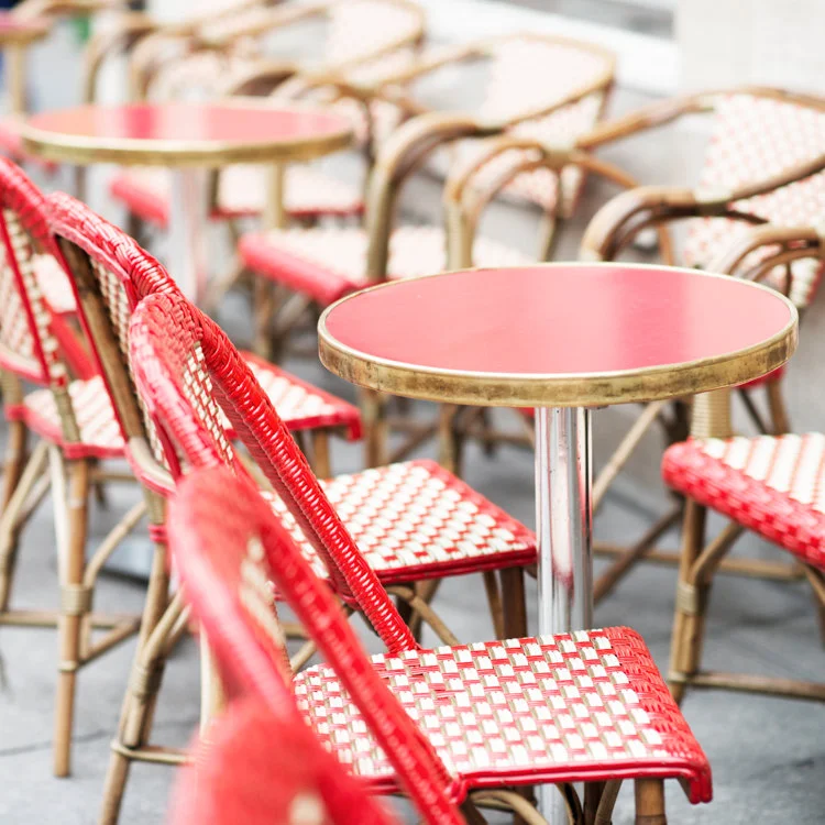 Red and white chairs at a typical Paris sidewalk cafe.