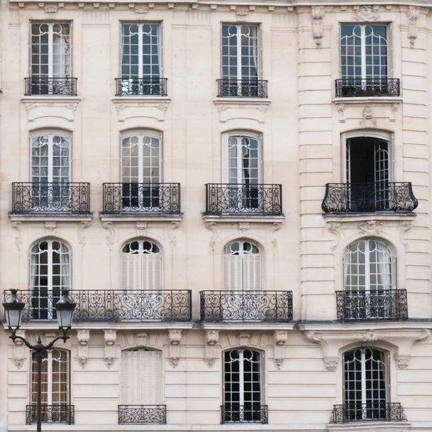 The marvelous scale of Parisian architecture as seen in the elegant windows and balconies on the Île de la Cité, in this black and white, sepia toned image. Taken in Paris in August, 2011.